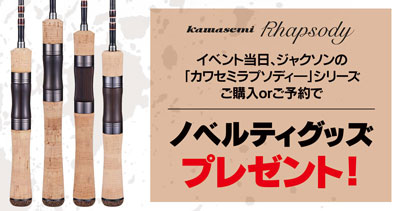 さらに及川氏が自らフィールドテスターを務めるジャクソンの人気トラウトロッド「カワセミラプソディ」を店頭展示して皆様のご注文を承ります!