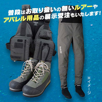 ゲームベスト、ウェーダー、シューズetc.機能性・デザイン性に優れたパズデザインの用品類や、普段はなかなか店頭に並ばないルアーなどを展示販売!ウェーダーやシューズなど、試着して自分にピッタリの一着を探してください。