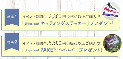 イベント期間中に対象製品を税込5,500円以上お買い上げで「Shipsmastジップバッグ」をプレゼント!