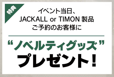 今回イベントにてJACKALLまたはTIMONの対象製品をご予約のお客様にノベルティグッズプレゼント