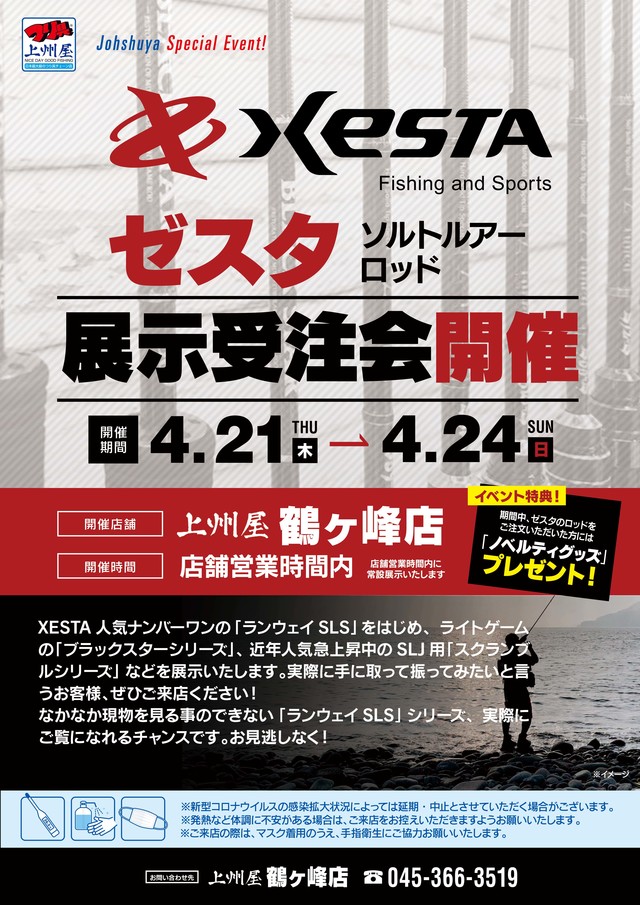 2022年4月21日(木)、22日(金)、23日()、24日(の4日間、上州屋鶴ヶ峰店にてXESTAゼスタ、ソルトルアーロッド展示受注会を開催します!