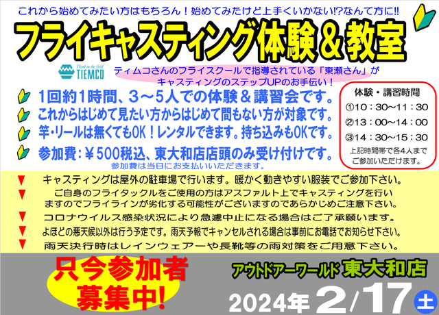 2024年2月17日(土)上州屋アウトドアワールド東大和店にてティムコ・フライキャスティング体験&講習会を開催します。
