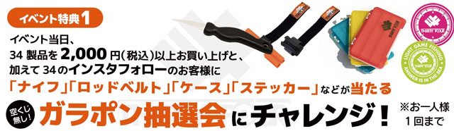 34対象製品を2,000円(税込)以上お買い上げ&34インスタフォローで、ナイフ、ロッドベルト、ケース、ステッカーetc.が当たる「ガラポン抽選会」にチャレンジ!※お一人様1回まで