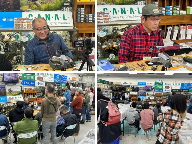 ティムコの嶋崎了さん、中峰健児さんが渓流ドライフライパターンからウエットフライ、ポンドや湖で活躍するストリーマーなどフライタイイング・デモンストレーションを実施!