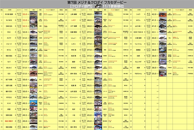 メジナ部門・クロダイ部門、11/1更新順位発表(10月分集計)。