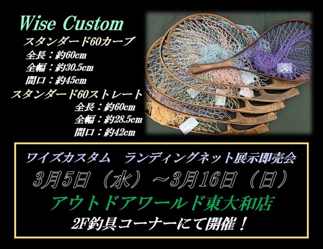 2025年3月5日(水)~16日(日)の12日間、上州屋アウトドアワールド東大和店にてワイズカスタム、ハンドメイドランディングネットの展示即売会を開催します!