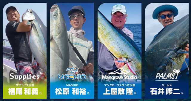 マングローブスタジオより上屋敷隆さん、パームスより石井修二さん、サプライズより椙尾和義さん、MASHIOより松原和裕さんが当日来店!各社人気ルアーやロッドの展示、限定ルアーの販売も実施します!