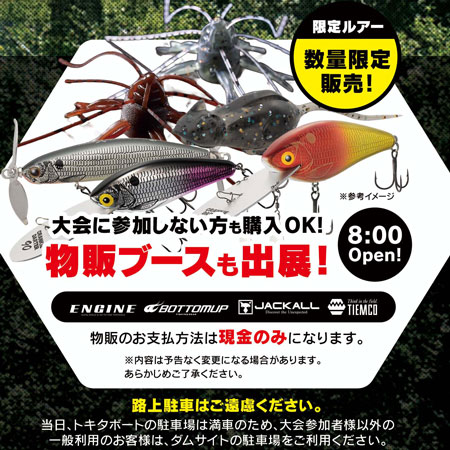 また、当日は「ENGINE(エンジン)」「BOTTOMUP(ボトムアップ)」「JACKALL(ジャッカル)」「TIEMCO(ティムコ)」の物販ブース8:00より現地出展!こちらは大会参加者でなくとも購入可能、ここでしか買えない限定商品をGETしてしまいましょう!