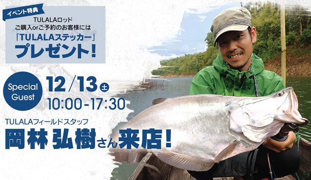 12月13日()10:00~17:30の時間帯には、TULALAフィールドスタッフ岡林弘樹さんが来店ご自分のスタイルにあったロッド選びのお手伝いなどアドバイスさせて頂きます!気になる来季モデルの情報も聞けるかも!?