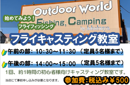 毎年恒例になりました初心者向けのフライフィッシングのキャスティング教室です。当店駐車場スペースにて開催、講師はティムコのベテラン講師:東瀬さん。これからフライフィッシングを始めたいと思っている方、始めてみたけど上手くいかない方、久しぶりにフライを再開した方etc.、この機会にフライキャスティングを学んでみましょう!約1時間のお手軽教室ですので、堅苦しくもなく楽しく参加頂けます!