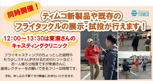 キャスティングスクールの合間12:00~13:30の時間帯には、ティムコ新製品や既存フライタックルの展示・試投、さらに東瀬さんによるキャスティングクリニックも開催します!