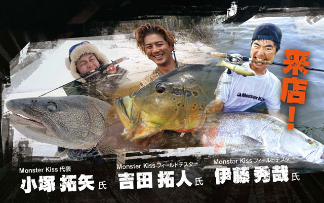 数多の海を渡り歩く怪魚ハンター、小塚拓矢さん(モンスターキス代表)、吉田拓人さん(モンスターキスフィールドテスター)、伊藤秀哉さん(モンスターキスフィールドテスター)の3人が店頭アドバイザーとして来店!