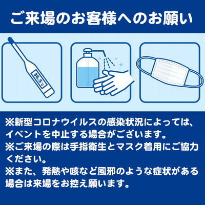 ※新型コロナウイルスの感染状況によっては、イベントを中止する場合がございます。※ご来場の際は手指衛生とマスク着用にご協力ください。※また、発熱や咳など風邪のような症状がある場合はご来場をお控え願います。