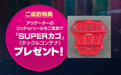 当日はLTアリシア、ビーダンサーなど数多くのアリゲーターロッドバトルリールが店頭に並びます。気に入った商品があれば即売OK!その場に無い仕様が御希望ならフルオーダーも可能です!今回イベントにてアリゲーターのロッドorリールをご成約で「SUPERカゴ(タックルコンテナ)」プレゼント