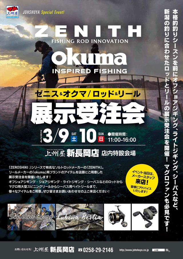 2024年3月9日(土)、10日(日)2日間の各日11:00~16:00、上州屋新長岡店にてZENITHゼニス&okumaオクマのロッド&リール展示受注会を開催します!