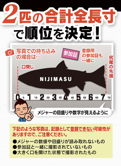 ・『持ち込みエントリー』店頭にて参加証をご提示の上、釣れた対象魚を直接開催店舗までお持込み下さい。店舗スタッフが検寸いたします。