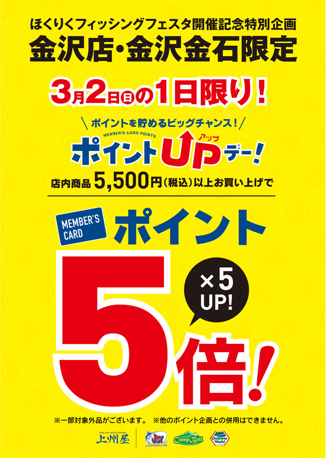 〔フェスタ開催記念〕2025年3月2日()、上州屋金沢店・金沢金石店にて店内税込5,500円以上お買い上げでポイント5倍