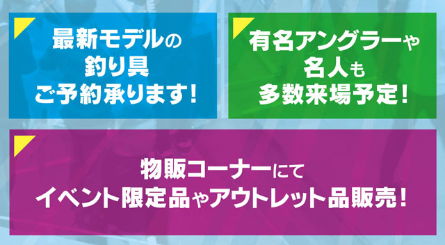 有名インストラクターや名人も多数来場予定!ステージイベントなどで盛り上がるほか、会場にて最新モデルの釣具の展示、ご予約・ご注文を承ります!