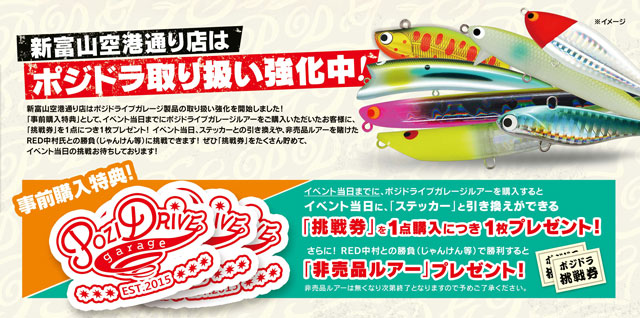 また、新富山空港通り店は只今ポジドラ取扱い強化中!『事前購入特典』として、イベント当日(3/29)までにポジドライブガレージルアーをご購入いただいたお客様に「挑戦券」を1点につき1枚プレゼント