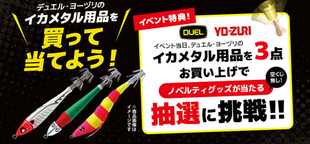 今回イベントにてDUELデュエル、YO-ZURIヨーズリの対象イカメタル商品を3点お買い上げで、ノベルティグッズが当たる抽選にチャレンジできます!