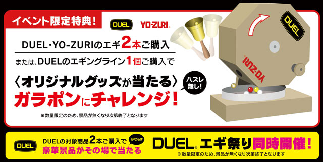 DUEL・YO-ZURIの対象エギを2本ご購入、もしくはDUEL対象エギングライン1個ご購入で、オリジナルグッズが当る!ガラポンに挑戦頂けます!