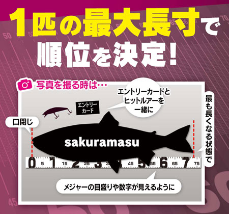 競技方法:福井、石川、富山各県の指定河川(※)にてルアー・フライ・エサ釣りで釣り上げた全長50cm以上のサクラマス1尾の最大長寸を競います。