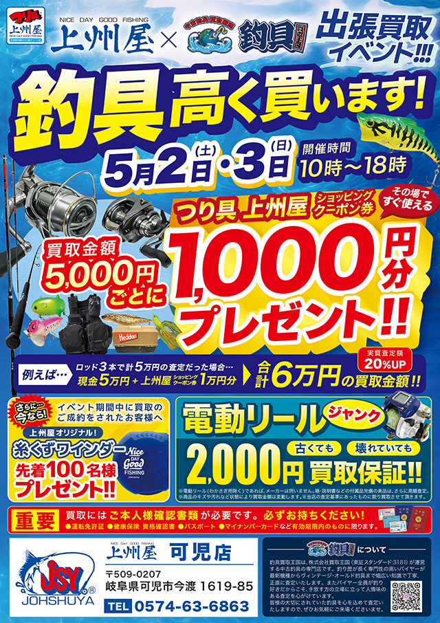 ※本イベントは事前のお申込みが必要です。イベント当日、現地での参加お申し込み受付は出来ません。※キャンセルによる参加費の返金をご希望される場合は、11/3(日)までに上州屋富士今泉店へご連絡をお願いします。それ以降のキャンセル料のお支払いは出来ませんので予めご了承下さい。※当日使用するルアーはジャクソン様にご用意頂けますが、その他タックル一式、ライフジャケットは各自ご用意願います。※本イベントはYoutube動画撮影を予定しておりますので、撮影にご同意頂ける方のみお申込み下さい。