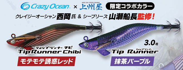 さらに当日は、クレイジーオーシャン×上州屋オリジナルカラー「ティップランナーチビ・モテモテ誘惑レッド」、「ティップランナー3.0号・抹茶パープル」も販売します。