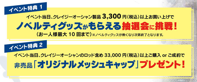 1)クレイジーオーシャン製品3,300円(税込)以上お買い上げで、ノベルティグッズがもらえる抽選会に挑戦!(お一人様最大10回まで/ノベルティグッズが無くなり次第終了となります。)