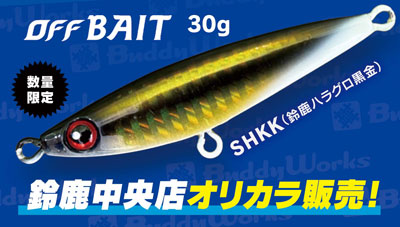 今回イベントでは当店ルアー担当が伊勢湾に効果的なカラーを研究開発した上州屋鈴鹿中央店オリカラ2025年度版、オフベイト30gSHKK(鈴鹿ハラグロ黒金)を数量限定販売!お見逃しなく!