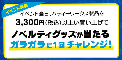 今回イベントにてバディワークス対象商品3,300円(税込)お買い上げで、ノベルティグッズが当たるガラガラに1回チャレンジ!