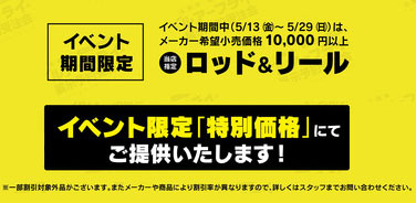 5月13日(金)~29日(日)期間中は、当店指定メーカー希望小売価格10,000円以上のロッド&リールをイベント限定特別価格にてご提供いたします!