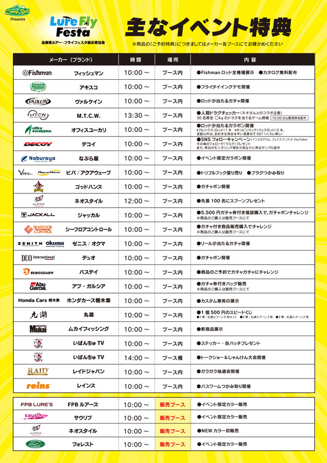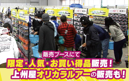 会場内、物販・即売コーナーでは、当日限りフェスタならではのレアモノ、上州屋オリカラ、アウトレットetc.様々な“限定商品”を特別販売致します!出展メーカーからの目玉品も続々登場予定!どうぞご期待下さい!
