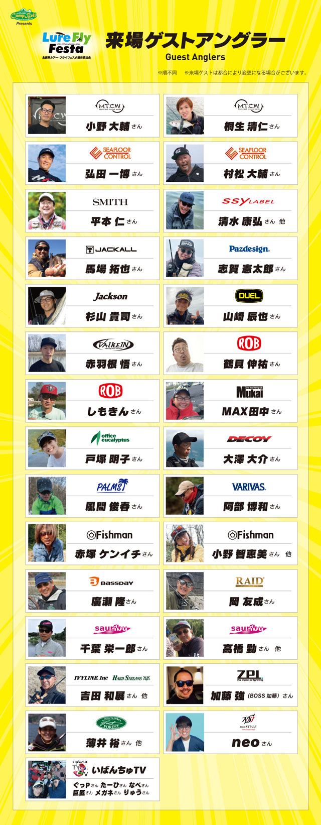 ※順不同 ※ゲストアングラー情報は本ページ更新日時時点の情報です。来場者は変更を伴う場合がございますので予めご了承下さい。