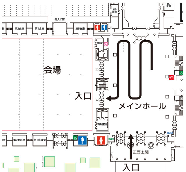 開場前後は混雑が予想されます。スタッフの指示に従い、メインホールに内に整列してお待ちください。場所取りは出来ません、お車等で待機している方もお並び願います。