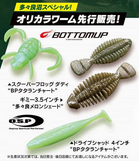 更に今年はオリジナルカラーのワームを作成しました!カラーは多々良沼をメインとした、舘林の3大沼(多々良沼・近藤沼・城沼)で実績の高いカラーをベースに考案、釣果に自信アリのカラーに仕上っております!