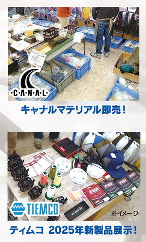 また、キャナルさんの豊富な在庫の中からご自身でマテリアルを選べる即売会も同時開催!ティムコの2025年フライ新製品も展示しますので、この機会をお見逃しなく!!