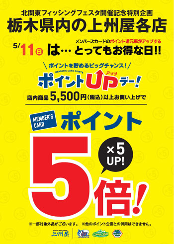 ※上記ポイント5倍は、栃木県内の上州屋各店“店頭”での特別企画です。マロニエプラザ大展示場「北関東フィッシングフェスタ2025」でのポイント発行はございませんので、ご注意ください。※一部対象外品がございます。※他のポイント企画との併用は出来ません。
