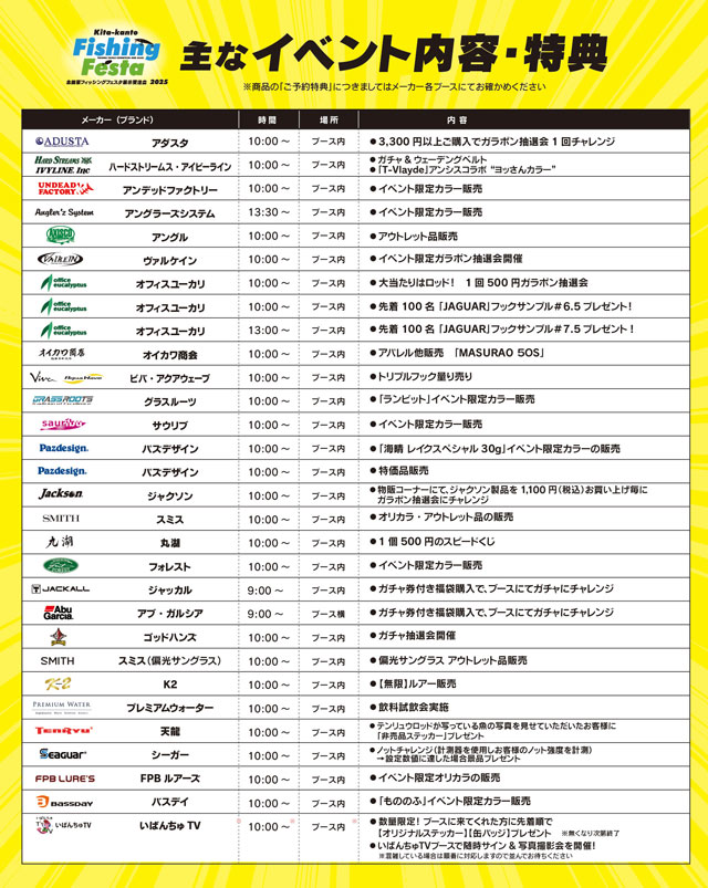 会場内、物販・即売コーナーでは、当日限りフェスタならではのレアモノ、上州屋オリカラ、アウトレットetc.様々な“限定商品”を特別販売致します!出展メーカーからの目玉品も続々登場予定!どうぞご期待下さい!
