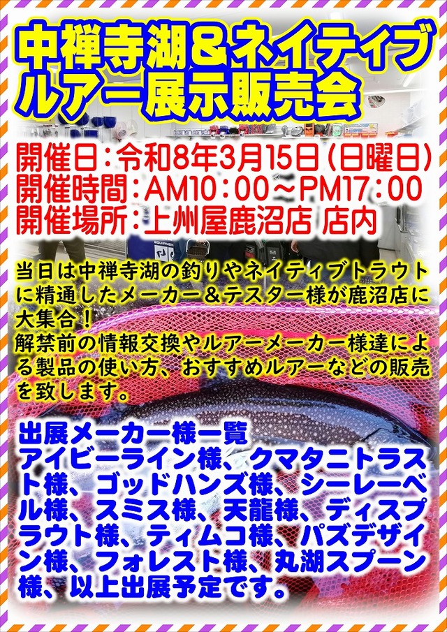 2026年3月16日(10:00~17:00(予定)、上州屋鹿沼店に中禅寺湖の釣りや、ネイティブトラウトに精通したメーカーとテスター陣が集結!中禅寺湖&ネイティブルアー展示販売会を開催します!