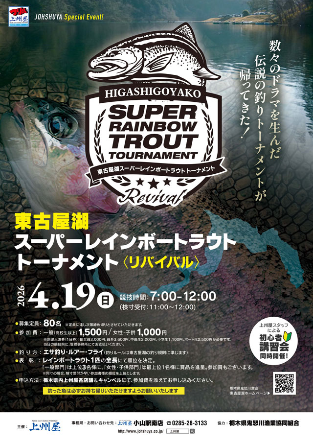 2026年4月19日(日)7:00~12:00、栃木県塩谷町“東古屋湖”にて東古屋湖スーパーレインボートラウトトーナメント<リバイバル>を開催します!