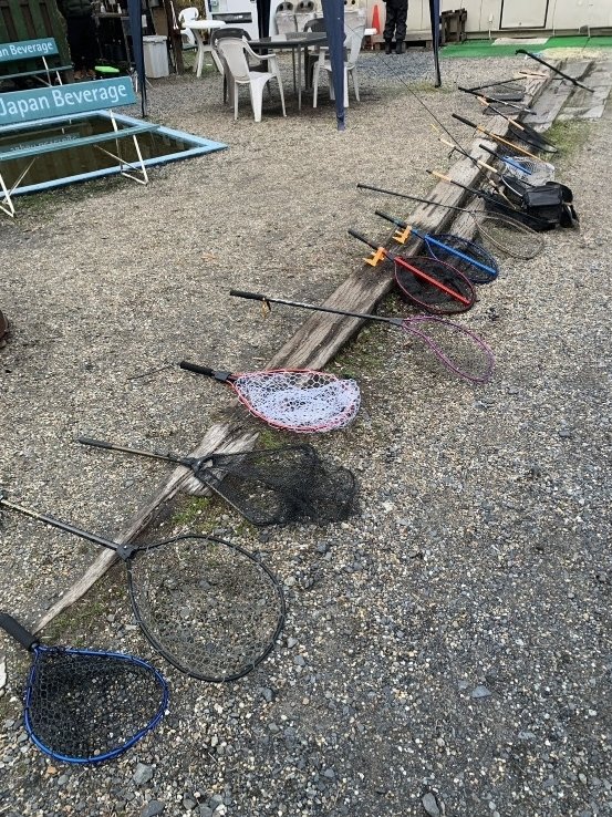 7時45分の受付開始に間に合うように到着後、タモを置いて受付順を待ちます(初めて釣行される方で早めに着いたら、写真のようにタモを置きます)