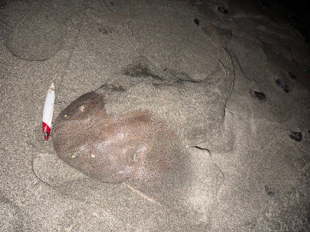 遠州サーフに行って来ました。PM2時半ごろ満潮からの下げ潮。北西風が爆風でうねり波もきつく状況がいいとはいえませんが、何かを期待してベイトタックルでゲームスタート。60gのメタルバイブをかっ飛ばして探りましたが開始早々にバックラッシュ高切れです。慎重さが足りませんでした。スピニングタックルに持ち替えて続行します。夕マズメからミノーにしましたが波が高く探りきれていない感じ。バスディー「オーディン130S」に替えてゆっくり探るとゴン!と何かがヒット。結構な重量感で上がって来たのはエイ?かと思いましたがカスザメでした。狙っていた魚では無かったですが始めてみる魚にドキドキ出来て納得して終了。またチャンスが出来たらチャレンジします♪