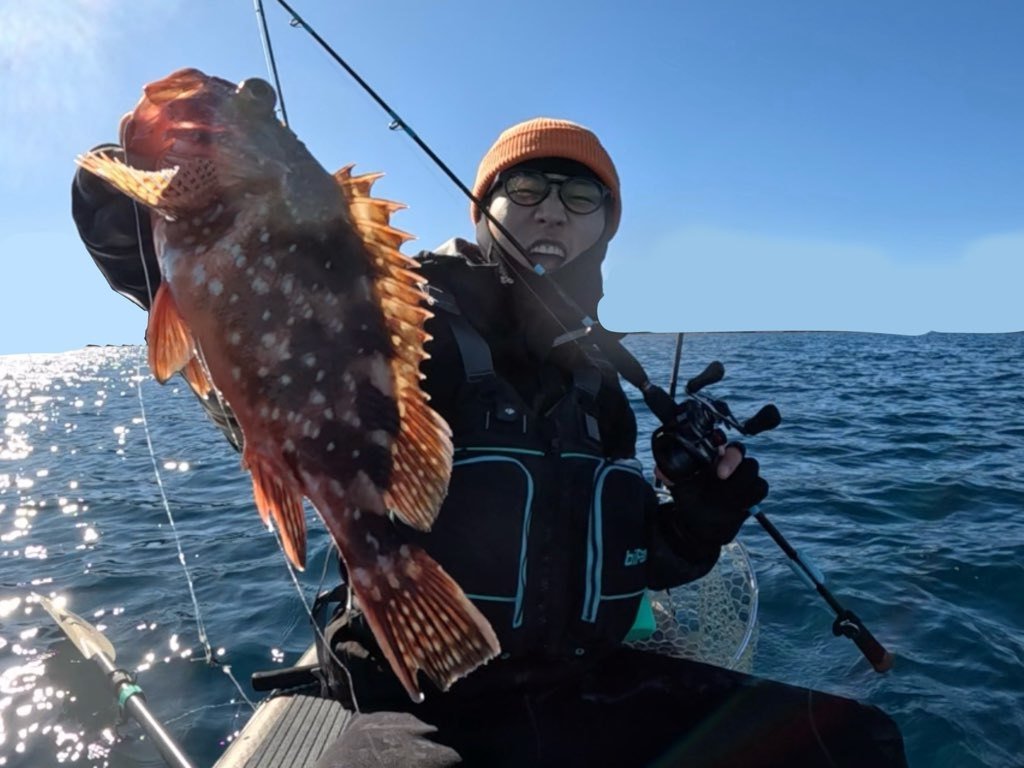 スタッフ北見です。友人K津さんと相模湾のボート釣り。たびかさなる延期の末なんとかでれました。冬でもタイラバ&キャスティングゲーム!前半ウネリ酷く、大荒れ。近場のポイントでスタートしていきなりのヒットはサバフグ。少しづつ移動するもフグ、フグ、フグ。海が落ち着き始め大きく移動してここで北見に良いアタリ♪でしたがラインブレイク。おろしたてのTGのヘッドを奉納。しばらくして浅い根周りでK津さんがボイルを発見して急行。背びれたてて何かがイワシ追いかけてる~。でもこういう時て釣れないですよね。手持ちのメタルジグ、ミノー、バイブ、ワームあらゆる物を投げ倒してノーバイト!ナブラの中を何度も通すも見向きもせず。意気消沈の2人ラスト1時間は、青物ポイントでタイラバ。K津さんが最後を飾る良型のオオモンハタ。北風も強くなりましたのであがりました。いや~それにしてもナブラの正体は何だったのか。気になります。お疲れ様でした。