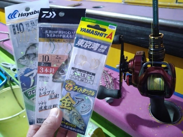■ロッド:ライトアジX170 ■リ-ル:スコーピオンMGL151HG ■ライン:PE1.5号 ■リーダー:フロロ4号 ■エサ:アオイソメ ■仕掛け:ヤマシタライトアジ2本針1.5号