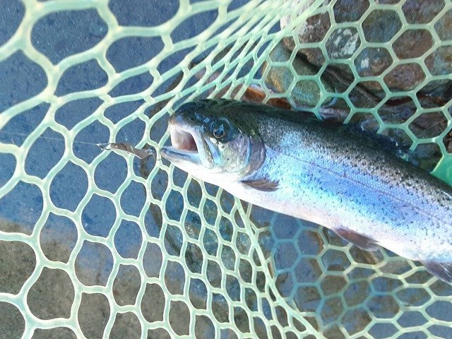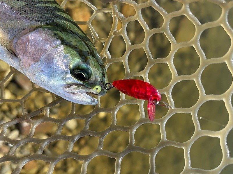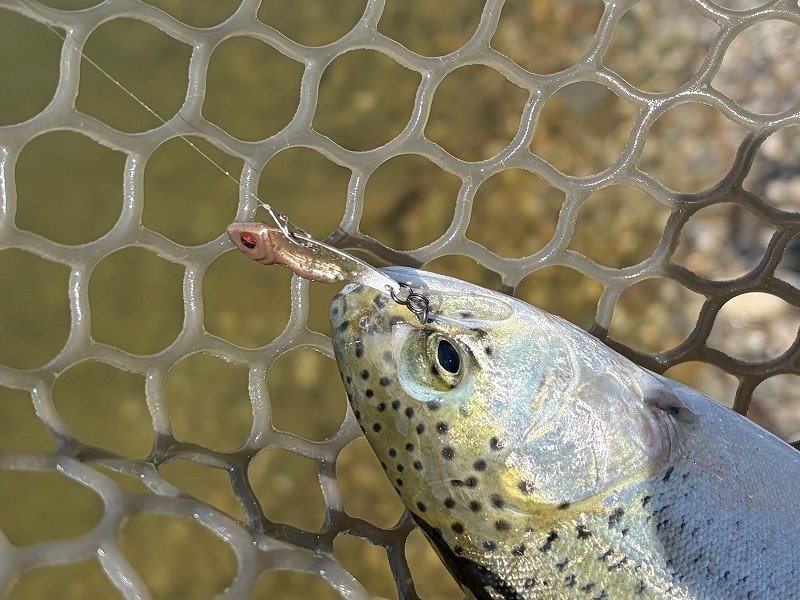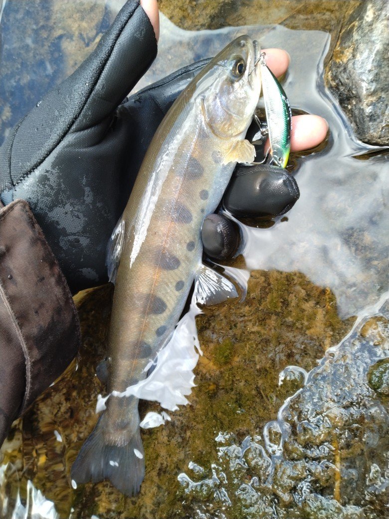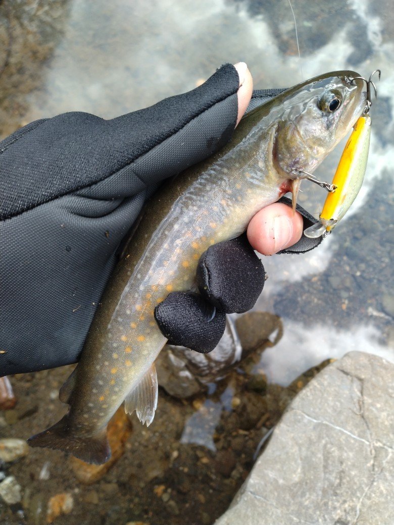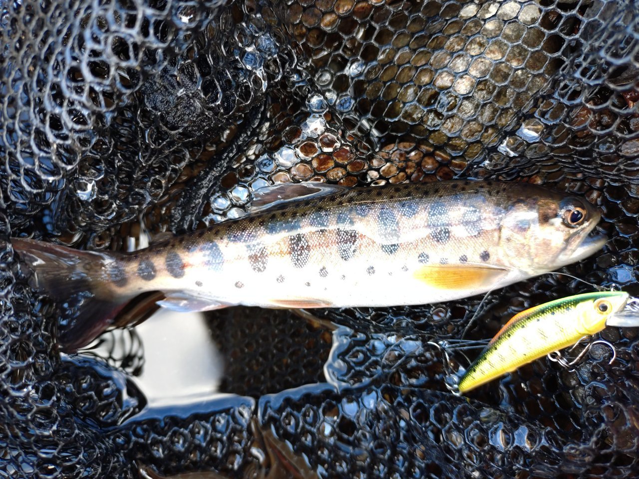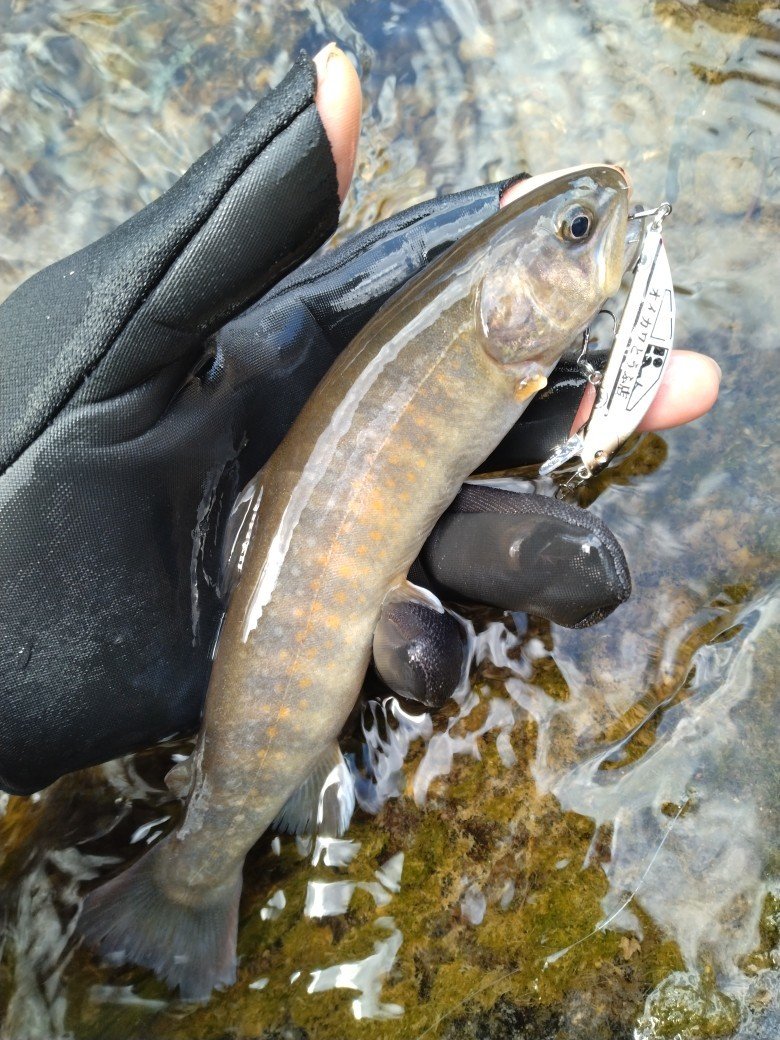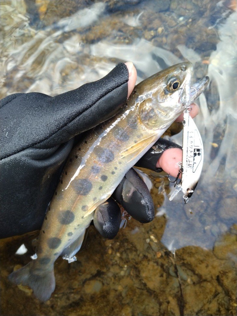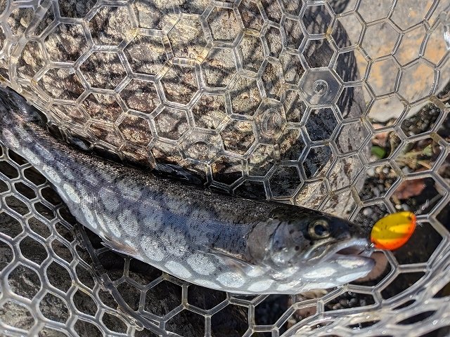 最強寒波に負けて午後券からスタートです。それでもかげっている所はやはり寒いです。当店でも推しのセロ♪同行者がその代表ですからこれをメインに。魚影の濃さはいうことなしです。あとはどぉ攻略していくかですね~。セロ1.2gでスタートです。魚影の濃さとは裏腹にやはりパターンをみつけないと一筋縄ではいかない・・・追尾はしてくるがUターン。流れに乗せてから少し巻きをゆっくりにしてみたらコンッと入り捕獲成功です。魚が上を意識しているようなのでセロ0.9g(プロト)をお借りしたらこれが本日のはまりパターンに♪流れにまかせてリトリーブ速度をゆっくりにリトリーブすると連発!発売が楽しみです。岡村さんはというと~ハイッちゃんとパターンを掴んでたぁ~くさん釣られていました♪流石です。イワナも混じりいいサイズも出て、引きも強いので楽しめましたぁ~♪パターンを掴めば数釣りもできるかなぁ~と思います。反応が無くなれば場所移動もできますのでおすすめです♪