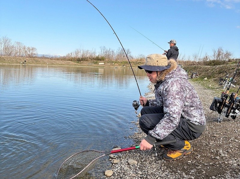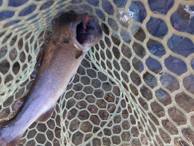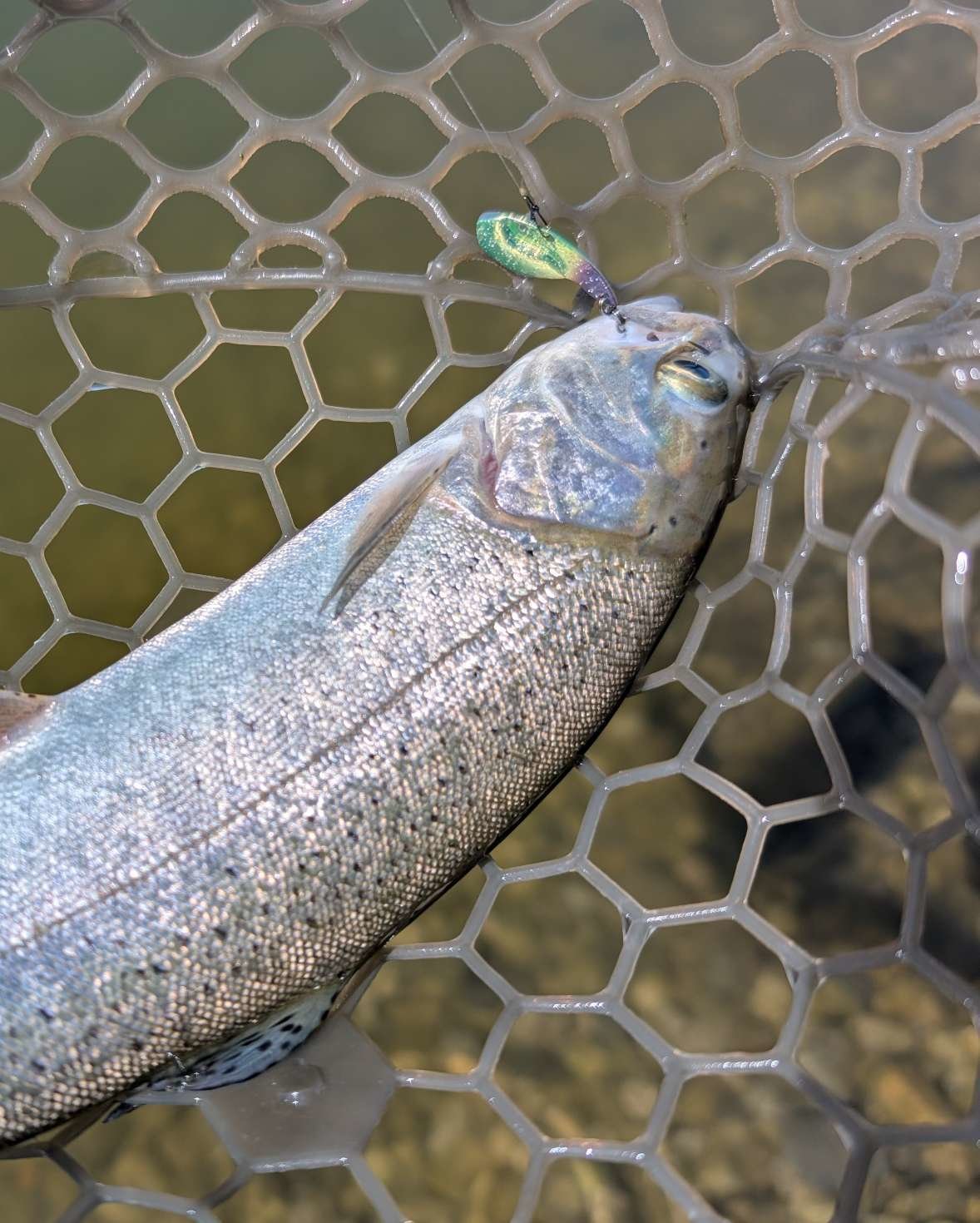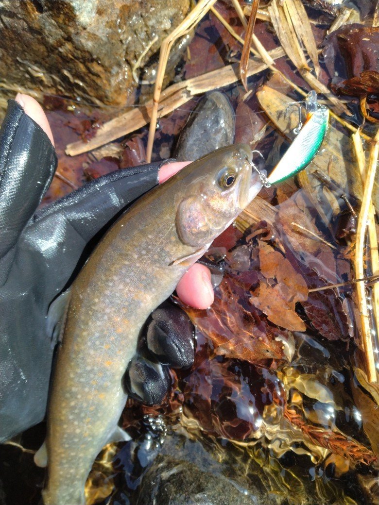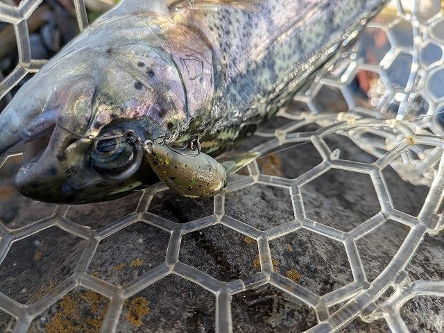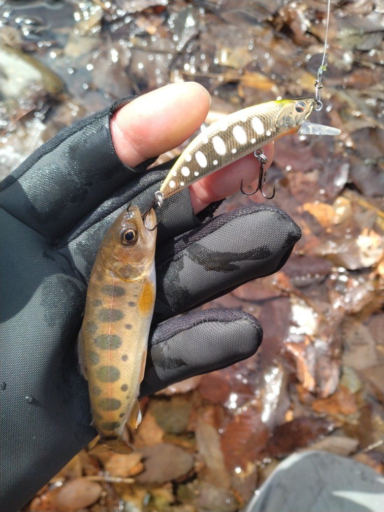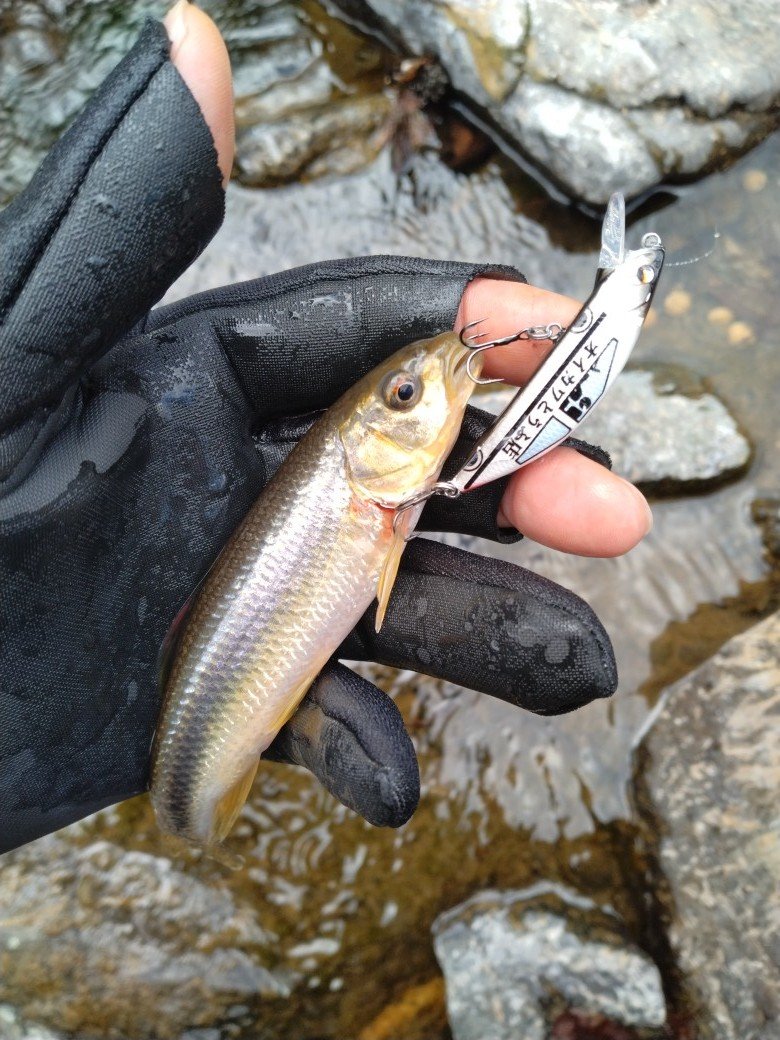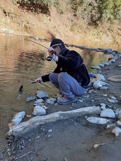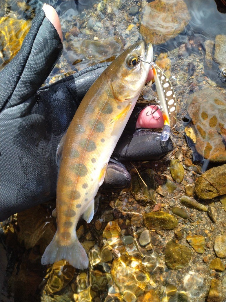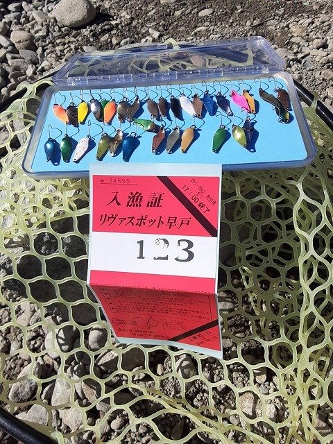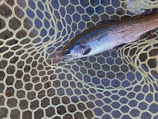 最強寒波に負けて午後券からスタートです。それでもかげっている所はやはり寒いです。当店でも推しのセロ♪同行者がその代表ですからこれをメインに。魚影の濃さはいうことなしです。あとはどぉ攻略していくかですね~。セロ1.2gでスタートです。魚影の濃さとは裏腹にやはりパターンをみつけないと一筋縄ではいかない・・・追尾はしてくるがUターン。流れに乗せてから少し巻きをゆっくりにしてみたらコンッと入り捕獲成功です。魚が上を意識しているようなのでセロ0.9g(プロト)をお借りしたらこれが本日のはまりパターンに♪流れにまかせてリトリーブ速度をゆっくりにリトリーブすると連発!発売が楽しみです。岡村さんはというと~ハイッちゃんとパターンを掴んでたぁ~くさん釣られていました♪流石です。イワナも混じりいいサイズも出て、引きも強いので楽しめましたぁ~♪パターンを掴めば数釣りもできるかなぁ~と思います。反応が無くなれば場所移動もできますのでおすすめです♪