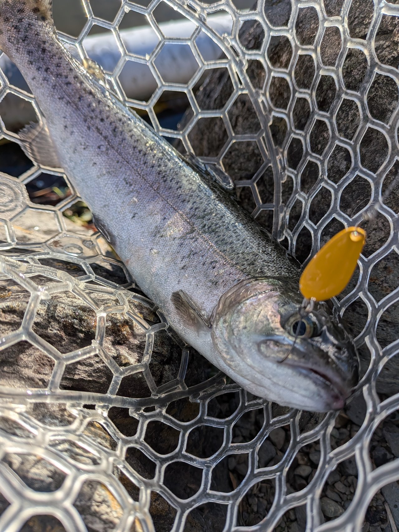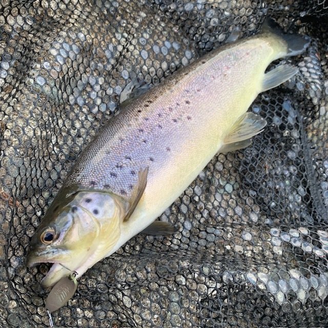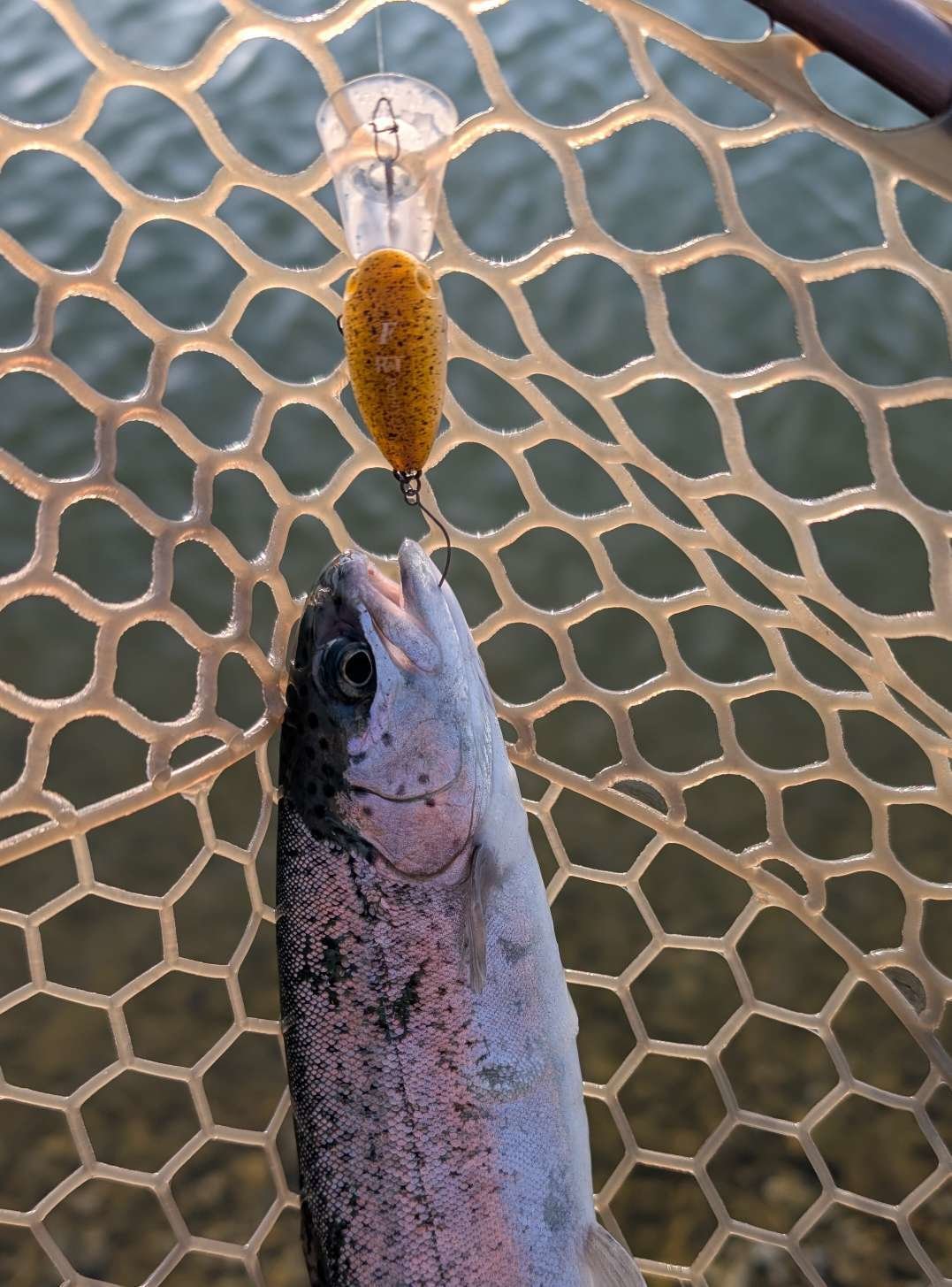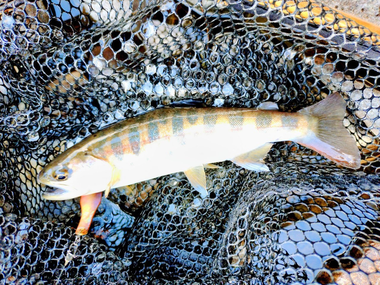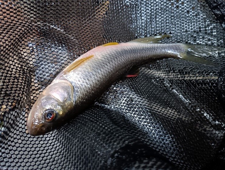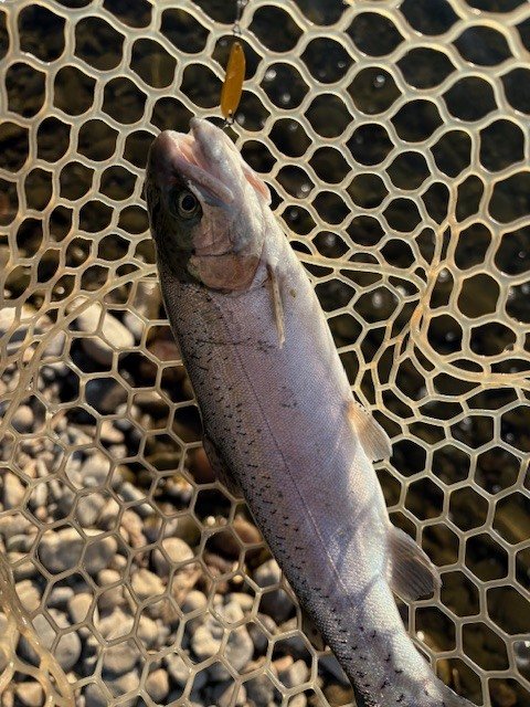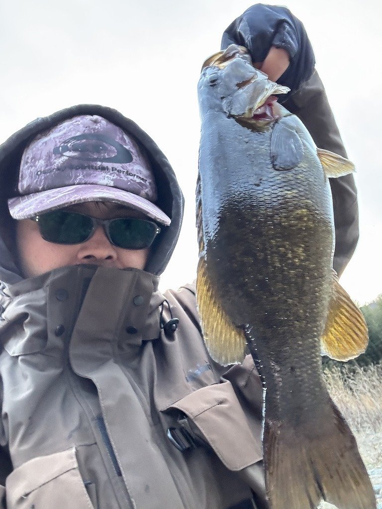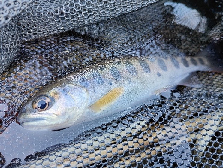 最強寒波に負けて午後券からスタートです。それでもかげっている所はやはり寒いです。当店でも推しのセロ♪同行者がその代表ですからこれをメインに。魚影の濃さはいうことなしです。あとはどぉ攻略していくかですね~。セロ1.2gでスタートです。魚影の濃さとは裏腹にやはりパターンをみつけないと一筋縄ではいかない・・・追尾はしてくるがUターン。流れに乗せてから少し巻きをゆっくりにしてみたらコンッと入り捕獲成功です。魚が上を意識しているようなのでセロ0.9g(プロト)をお借りしたらこれが本日のはまりパターンに♪流れにまかせてリトリーブ速度をゆっくりにリトリーブすると連発!発売が楽しみです。岡村さんはというと~ハイッちゃんとパターンを掴んでたぁ~くさん釣られていました♪流石です。イワナも混じりいいサイズも出て、引きも強いので楽しめましたぁ~♪パターンを掴めば数釣りもできるかなぁ~と思います。反応が無くなれば場所移動もできますのでおすすめです♪