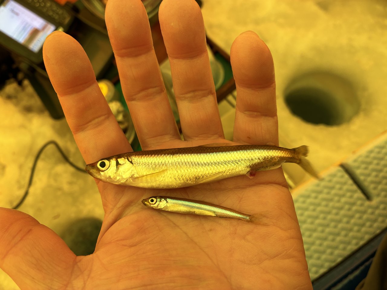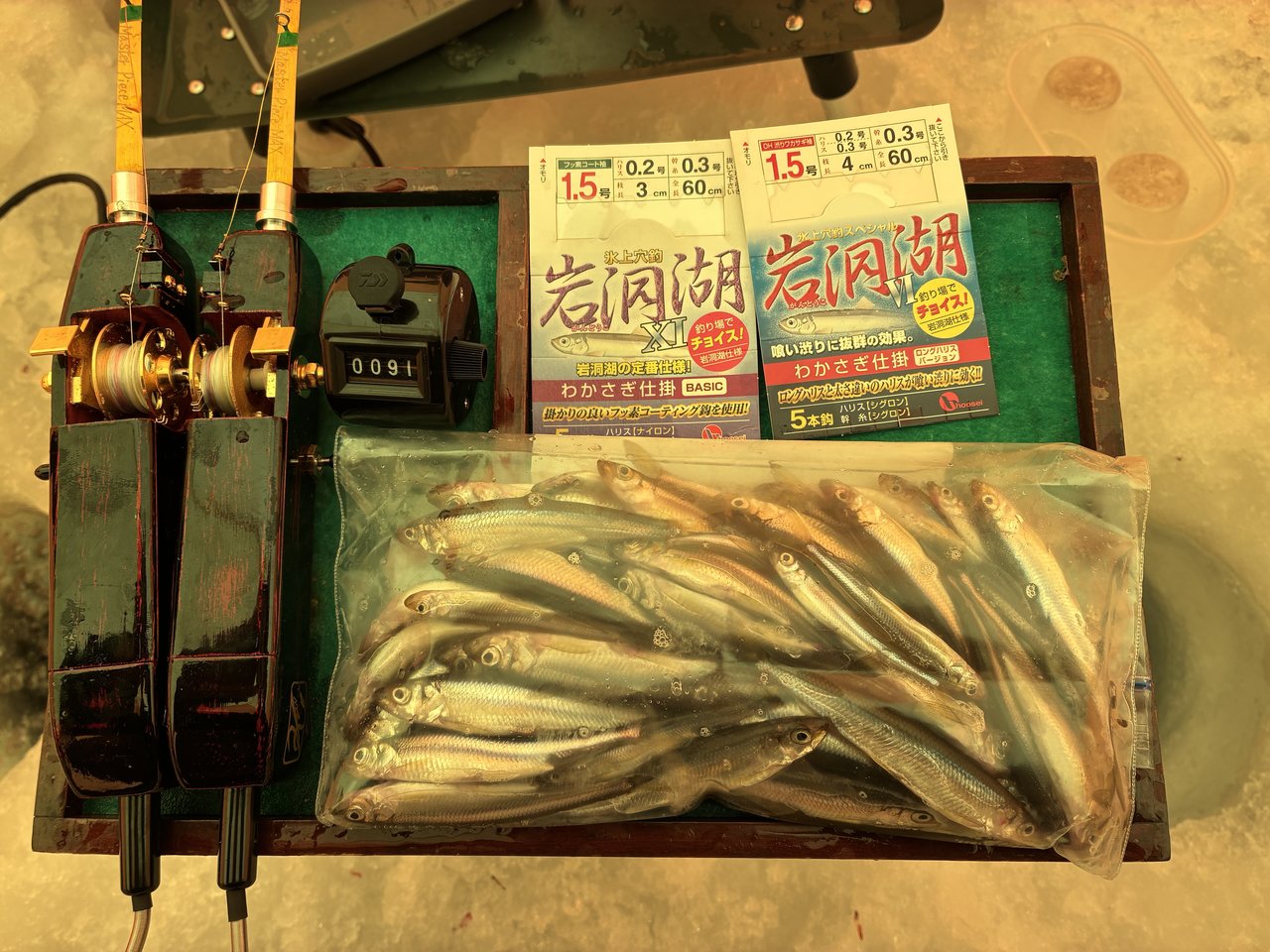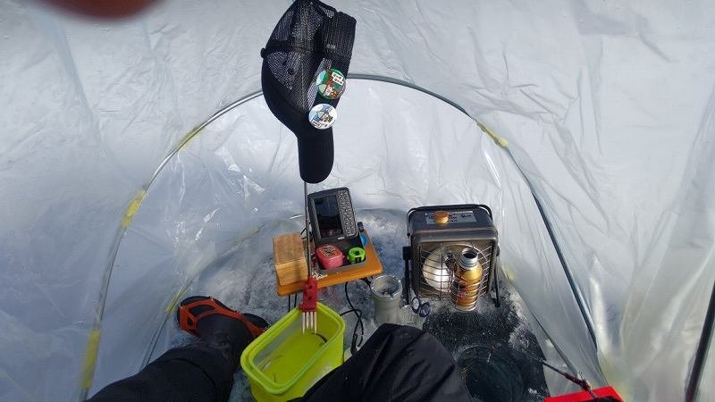 朝練2日目!昨日とは打って変わって猛吹雪!前日の場所をGPSを打たなかったので雪で全てがリセット!でも何とな~く前日と同じような場所にテントを立て開始。反応は昨日よりも良い感じなのですが食いはイマイチ。誘えばポツポツ釣れる感じでタイムリミットの9:30迄で91匹の釣果でした。