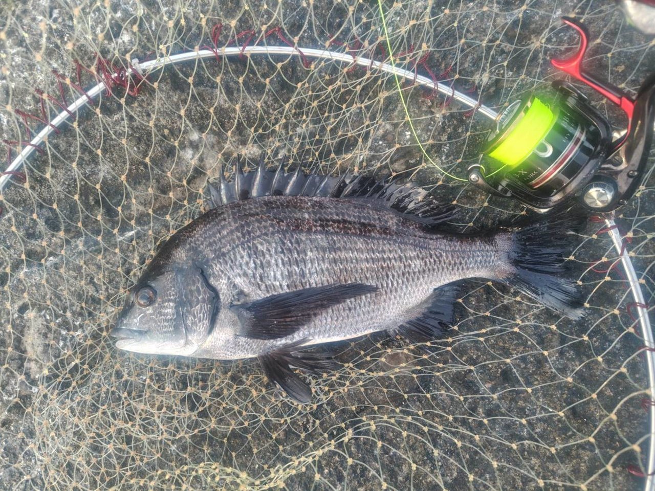 6時頃からポイントに入って釣りを始めて、エサ取りに邪魔されながらも8時過ぎに当日最大の本命メジナ(35cm)を釣りあげたとのこと。おめでとうございます。